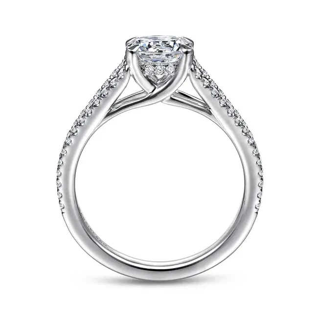 This exquisite engagement ring features Gabriel & Co's white diamond accents and a sparkling cubic zirconia center stone. The center stone is fully customizable and can be easily swapped for a diamond or another gemstone of your choice. Our team is happy to assist you in selecting and fitting the perfect stone to create a ring that's uniquely yours.